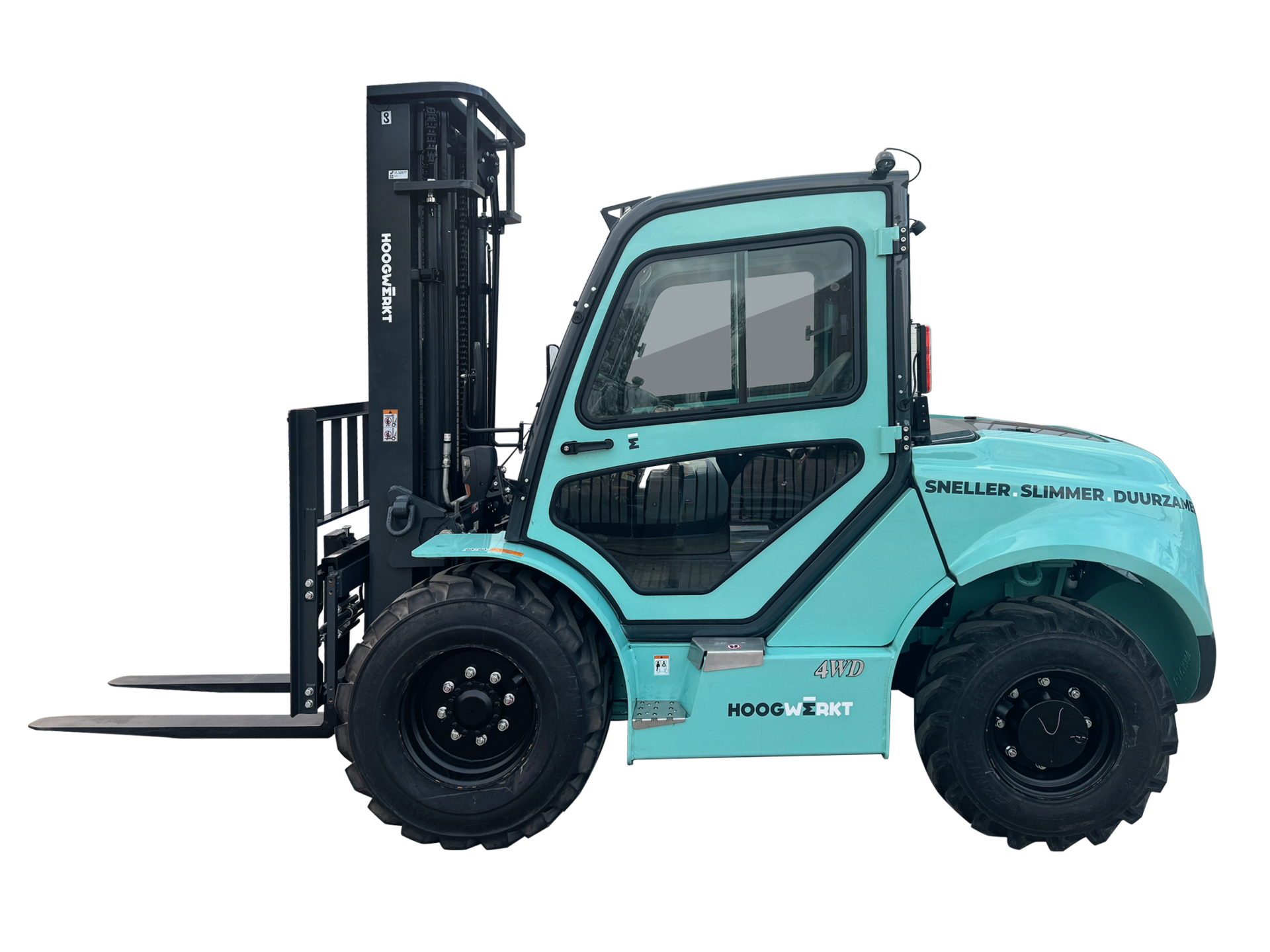Deze ruwterrein heftruck biedt maximaal comfort dankzij de gesloten cabine met verwarming, verstelbare stoel met armleuningen en een duidelijk kleurendisplay. Ruitenwissers zorgen voor goed zicht in alle weersomstandigheden.
